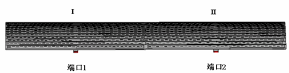 该模型由12根辐射波导和两根馈电波导组成。辐射波导之间都有扼流槽,每根辐射波导上都有68个左右的辐射缝隙。天线阵被分成I、II两个子阵,两个馈电波导分别位于两个子阵中。每根馈电波导上都有对应于辐射波导的12个馈电缝隙,金属膜片与馈电缝隙相对应。