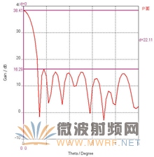 可以看出,天线增益达到了38.4dB,P面副瓣电平:-22.1dB,波束宽度为0.6°;Q面副瓣电平-13.3dB,波束宽度为5.6°。仿真结果和理论设计取得了较好的一致。