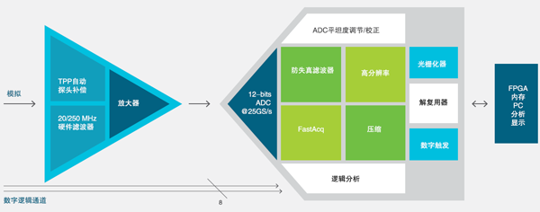 TEK049 团队重新构思了这条信号路径,包括模数转换器、解复用器、触发功能和逻辑分析功能。这实现了高采样率、高垂直分辨率,模拟通道和数字通道实现了完全相同的采样速度,同时实现了FlexChannel技术。而且,TEK049紧密地整合模拟通道和数字通道,既支持实时信号处理,又能够实现业内第一个FlexChannel 输入,既可以作为一条模拟通道运行,也可以作为八条数字通道运行。