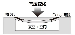 压阻效应与因应力产生的极化现象--压电效应不同,是因施加于电阻的应力使电导率即电阻率变化的现象。这种现象是晶格因所施加的应力产生畸变,使半导体中的载流子数量和迁移率发生变化而引起的。膜片受到压力而弯曲时,各Gauge电阻产生与膜片的弯曲量相应的应力。Gauge电阻(压阻)的电阻率与该应力成正比变化,将由此产生的电阻变化作为电压变化来检测出气压。但是,由于该电阻的变化极其微小,因此,利用4个电阻的惠斯通电桥电路实现高灵敏度。