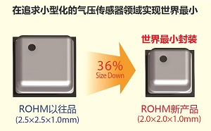 随着气压传感器的用途越来越广泛,对更高精度的气压检测和高度检测功能的需求越来越大;同时,随着智能手机和可穿戴式设备的小型化、高性能化发展,对传感器的小型化要求也越来越强烈。为满足这些需求,ROHM预计于2016年4月份开始量产"BM1385GLV"。该产品继承了已经开始量产的BM1383GLV的特点,并通过优化气压检测用MEMS和控制电路,使面积比ROHM以往产品再缩减36%,是世界最小封装(2.0mm×2.0mm×1.0mm)的气压传感器。(图4)(截至2015年7月14日ROHM调查数据)