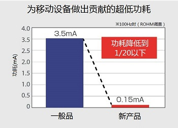 与搭载了高灵敏度MI元件和超强抗噪的高精度A/D转换器的模拟前端电路相结合,成功将σ噪音的影响降低到0.06μT,仅为普通产品的1/7。由此,实现了业界最高的方位检测精度误差±0.3度以下,有助于推动IoT和传感器网络的创新速度,实现以室内导航为首的崭新的传感器应用。第二个特点是非常适合移动设备的超低功耗。(图6)