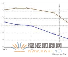 图2,图3给出了无覆层和有覆层时圆极化缝隙天线方向图增益比较,从蓝色增益曲线可以看出,在不加介质覆层时,对于单环缝隙天线,中心频率12GHz其主瓣最大增益为10.8dB,半功率波瓣宽度为74°;当加了高折射率介质层后,从橙色增益曲线可以看出其增益达到13.5dB,半功率波瓣宽度为36°,增益提高了2.7dB。这对缝隙天线来说,其增益增加的程度相当可观。图4给出了无覆层和有覆层时圆极化缝隙天线的驻波比比较,加上介质覆层后,在所需的工作频段内驻波比均小于1.2。当加上介质层时,在介质覆层作用下,该天线的方向图呈现很明显的汇聚现象,驻波比也有了明显的改进。