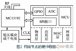射频通信模块选用FREESCALE公司的MC13192 RF收发器,它内部包含了完整的IEEE 802.15.4标准的物理层(PHY)调制解调器,用于支持IEEE 802.15.4标准所规定的点对点、星状和网状网络通信。通信中,该收发器的包差错率在1.0%时,输出功率小于-92 dBm(典型值),远远低于IEEE 802.15.4标准所规定的-85 dBm。