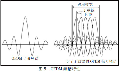 从图5中可以看出,由于OFDM技术的频率特性,各子载波间的频率响应是正交的。子载波间隔大大减小,从而使频率利用效率大大提高。LTE系统采用的各子载波间隔为15kHz,可以充分满足奈奎斯特准则。
