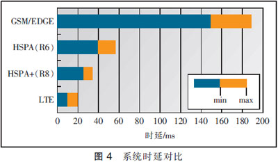 图4显示了各系统的时延对比。设备商的性能各不相同,所以每种系统的时延都用最大值和最小值的区间来表示。可以看出,LTE的时延均小于20ms,满足系统设计要求,相对于HSPA+也有一定的优势。