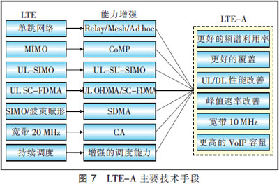 LTE采用正交频分复用(OFDM)、多进多出天线(MIMO)等物理层关键技术以及网络结构的调整获得性能提升。LTE-A则引入了一些新的候选技术,如载波聚合技术、增强型多天线技术、无线网络编码技术和无线网络MIMO增强技术等,使性能指标获得更大改善。
