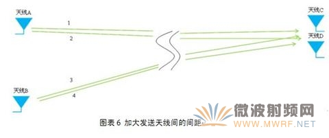 现在困扰我们最大的问题,就是传播路径纠缠在一起,若能分离出各条路径,问题也就迎刃而解了。我们回到2x2的MIMO系统上,灵感来了,如果我们加大天线间的距离,不就能区别出传播路径了么?沿着这个思路,我们首先拉大两个发送天线的间距。现在,尽管路径1和2,3和4之间还无法区分,但两天线间的路径已经明显分离了,换言之,我们恢复出了两个分集增益,成功了第一步。接下来,我们再拉大接收天线间的距离,现在,4条路径都清晰可辨,MIMO系统获得了重生!