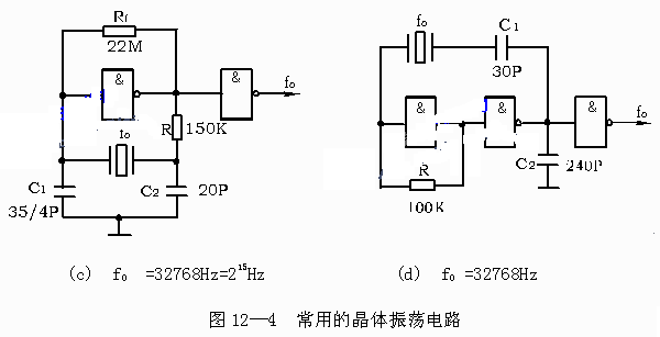 (c)、(d)为CMOS器件组成的晶体振荡电路, 一般用于电子表中,其中晶体的f0=32768Hz。