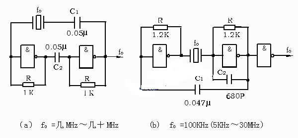 (a)、(b)为TTL器件组成的晶体振荡电路;