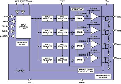 四通道12位高压DAC AD5504提供引脚可选的0 V至30 V或0 V至60 V输出范围。该器件功能完整,内置精密基准电压源、温度传感器、四个双缓冲DAC和四个高压放大器。上电时,数字部分使能并设置为已知状态,模拟部分则保持禁用状态,直到通过SPI端口发出上电命令。如果芯片温度超过110°C,温度传感器将断开模拟输出,并设置一个报警标志。在30 V模式下,AD5504的最大微分非线性(DNL)额定值为1 LSB,而最大积分非线性(INL)额定值为3 LSB。它采用10 V至62 V和2.3 V至5.5 V电源供电,正常模式下的功耗为2 mA,而掉电模式下的功耗为30 μA。它采用16引脚TSSOP封装,额定温度范围为–40°C至+105°C,千片订量报价为9.92美元/片。