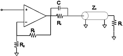 图2给出了驱动传输电缆(如同轴电缆)的典型电路配置图。电阻Rs和RL应该等于电缆的特征阻抗(Zo),而电容C应该可被用来在更大的频率范围对电缆进行匹配,以对随频率提高而增加的放大器输出阻抗进行补偿。