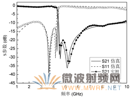 图9 三SSRR单元的电通滤波器的电磁仿真与实测结果比较