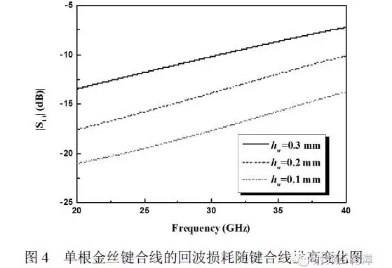 如图4,表示单根金丝键合线的拱高变化对传输线回波损耗的影响。随着键合金丝的拱高hw 增加,键合金丝长度l 增大,L 增大,R 减小, 回波损耗变小,插损损耗变大。