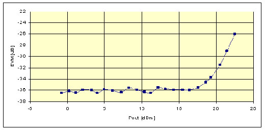 发送器的关键性能参数是其在给定功率下的误差矢量幅度(EVM)。EVM 表示数组(digital constellation)通过发送器之后的完整性。发送器EVM 衰减的主要原因在于本机振荡器(LO) 源和最终功率放大器的相位噪声。由于功率放大器的影响非常大,我们有必要讨论一下发送器在给定输出功率条件下的EVM 性能。EVM 参考为2.7%。与蜂窝式系统及802.11 参数不同,EVM 的要求要严格得多,我们通常以分贝为单位来计算EVM 值,从而提高精确度。2.7% 的标准值相当于-31.4 dB。我们根据EVM 为-31.4 甚至更好的情况下的最大额定调制功率来确定发送器的性能。