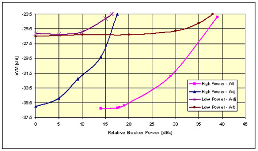 图3 显示了接收机EVM 曲线以及-20 dBm 的ADC 恒定输入功率。根据该图形信息我们可得知接收机灵敏度,不过仍不能确保阻断测量情况符合标准要求。与发射器相比较,接收机需要特定的带宽限制滤波器来满足相邻通道的阻断要求。该架构可支持高IF SAW 滤波器和两个可交换的即时低IF滤波器。高IF滤波器有10 MHz 的带宽可传输10MHz或更低带宽的所需信号。低频IF SAW 无需修改任何硬件即可支持两个不同的信号带宽。TRF1212 中AGC 放大器的过滤机制加上较大的动态范围,有助于满足灵敏度方面严格的阻断规范要求。凭借上述方法以及TRF1216 LNA 中的集成可交换衰减器,我们可以成功进行高功率的阻断测试,有助于提高高功率情况下的线性。图4 显示了TSW5003 的阻断性能。