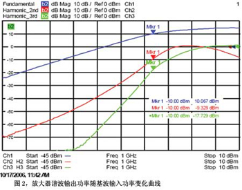 随着激励功率的增加,放大器将进入非线性工作区,不仅会出现输出功率压缩现象,还会出现非线性频率分量。这些新的频率输出分量多为输入频率的整数倍,称为谐波分量。设计人员往往比较关心的是输入基波分量与谐波分量的幅度差值,因为幅度差越大,意味着在同样的直流输入功率情况下,更多的功率转换为所需的基 波功率,而非谐波功率,也可视为提高了放大器的效率。