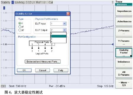 通过简单的设置,ZVB就可进行放大器稳定性测试(图4),对应选择[Format]键下的[Stability]菜单,在弹出的对话框里选择输入、输出端口和测试稳定性因子的类型即可。