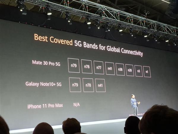 在频段方面,Mate 30系列5G手机支持N79、N78、N77、N41、N38、N27、N3及N1多个频段,相比之下三星的Galaxy Note 10+5G手机只支持N79、N78及N41频段,而苹果的iPhone 11系列手机完全不支持5G。