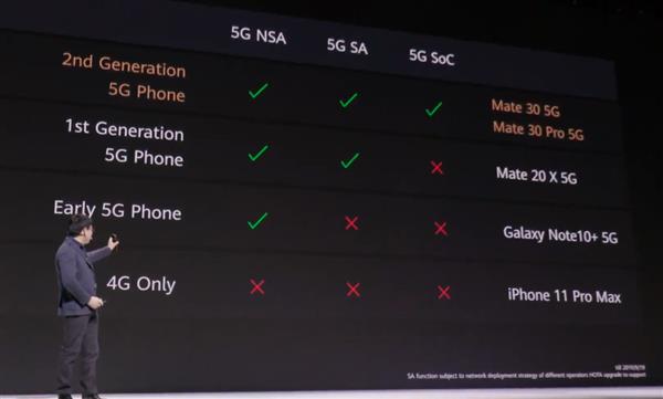 余承东称,华为Mate 30系列支持双VoLTE,在使用VoLTE通话的同时,另外一张卡可以同时支持5G上网。同时,华为Mate 30系列采用麒麟990 SoC集成了5G基带,并支持SA、NSA双组网。