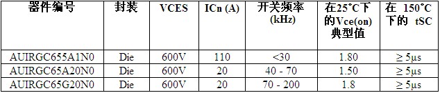 AUIRGC655A1N0 针对主要的电动车和混合动力车逆变器及大型电机驱动器进行了优化,而AUIRGC65A20N0和AUIRGC65G20N0 则面向电源和高开关频率应用。这两款器件除了提供更高的最高结温和高达200kHz 的硬开关之外,由于具有更低的传导损耗和更高的效率,在谐振零电流开关 (ZCS) 拓扑结构中还能为更高电流的优化性能。