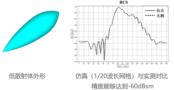 针对“传统FDTD软件对低散射体RCS计算普遍不准”的问题,东峻公司开发了针对低散射物体RCS精确计算的模式。低散射体特征为尖头、扁平、大后掠、外形线平滑等,RCS值达到-35dBsm或更低,传统FDTD软件需要划分1/100波长网格,这造成内存和计算量暴涨而“不能算”。东峻低散射体RCS模式,在1/20波长网格就可以精确计算-60dBsm的RCS值。