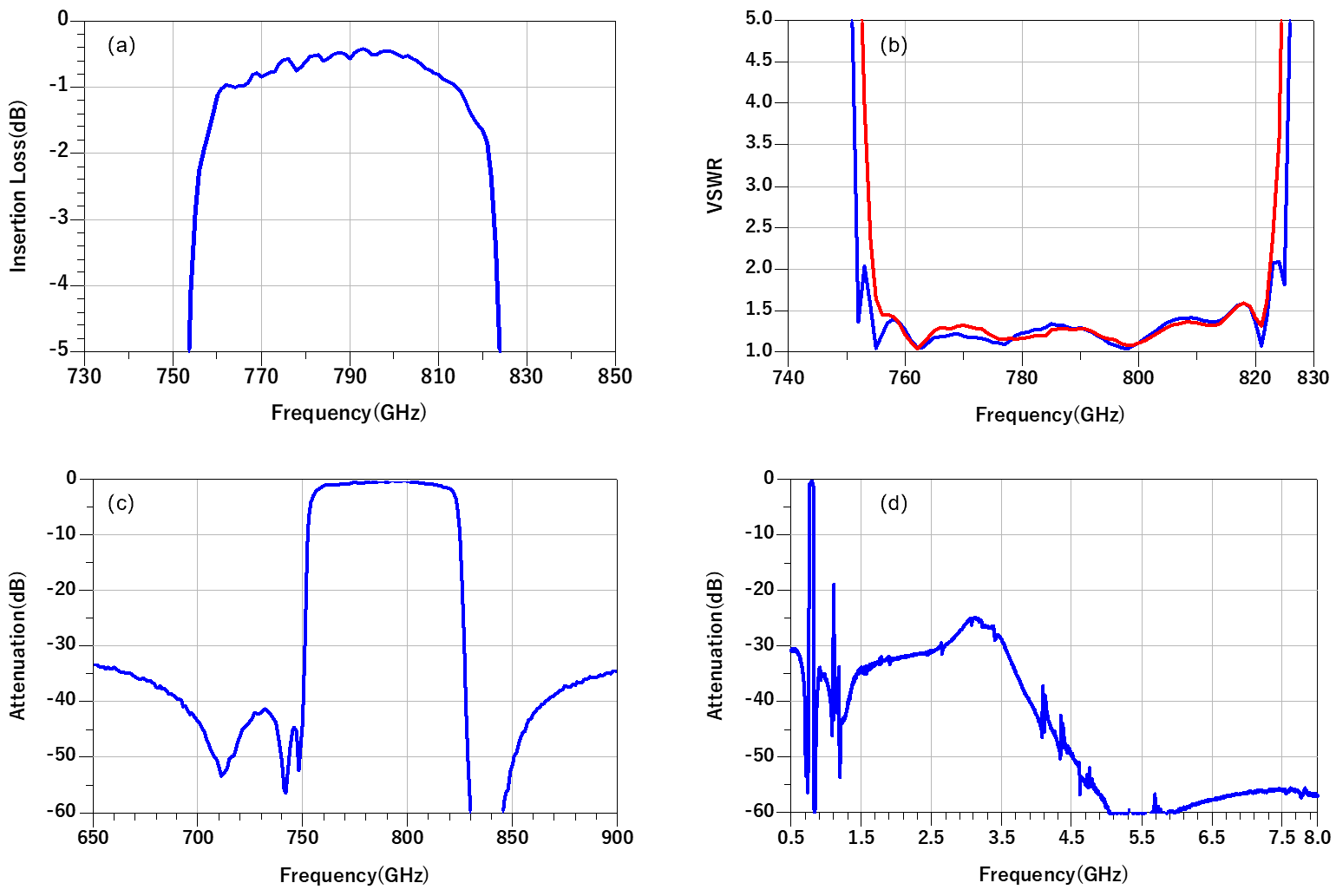Fig.6. 星曜半导体TF-SAWBand 20+28F Dual-Rx滤波器测试性能(a)Insertion Loss;(b)VSWR;(c) Narrowband Attenuation; (d) Wideband Attenuation