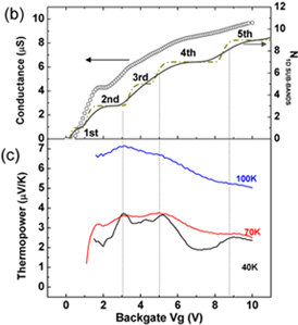 图3. 40K时热电势S(蓝色),电导G(红色)和电导变化dG/GdVg(紫红色)对栅压的依赖关系,表明热电势的振荡与电导的台阶式变化都是砷化铟纳米线中电子填充一维子能带造成的。