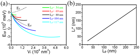图3:(a)应变引起的分子量子点中的总弹性相互作用能在不同坑洞尺寸下随岛尺寸的变化。虚线表示Lp=80 nm时坑-岛相互吸引作用和岛-岛相互排斥作用随岛尺寸的变化。(b)应变引起的总弹性相互作用能达到最小时的岛的尺寸随坑洞尺寸的变化。
