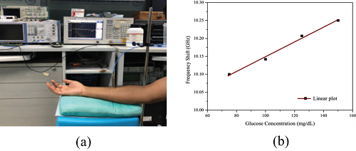 图2、(a)高场约束的表面等离子体血糖传感器实验测量场景;(b)实验测量结果