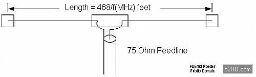 偶极型天线如图呈T型,T型的水平部分长度为波长的1/2,波长若12.5cm,则T型水平部分长度应为6.25cm。