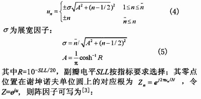 当u=2mπ,m=O,±1,…时,S取最大值,且m=0时为主瓣。为了实现低副瓣并使主瓣展宽,采用中心馈电从阵中到边缘幅度递减,按泰勒线源分布加权各缝隙,两边呈对称分布,其方向图零点位置由下式决定: