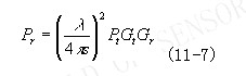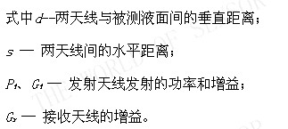 图11-5为微波液位示意图,相距为s的发射天线和接收天线间构成一定的角度。波长为λ的微波从被测液面反射后进进接收天线。接收天线接收到的功率将随被测液面的高低的不同而异。接收天线接收的功率Pr可表示为