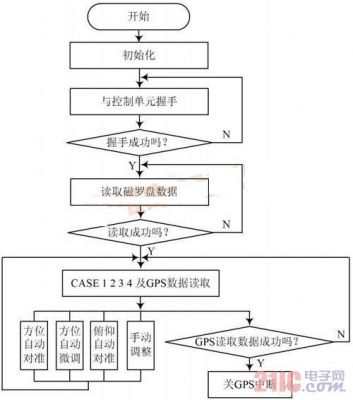 首先系统启动之后,进行初始化,然后等待磁罗盘接收信号有效,否则不能进入电机控制任务。在自动运行状态,此时平台处于静止状态,程序对接收到的串口数据进行计算处理后实时更新,并不停地向显示控制单元汇报天线与目标指向的夹角大小。