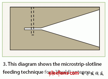 Vivaldi天线选择采用微带到槽线转换,因为与其它方法相比,此方法有许多优点。一个主要优点是这种转换可以方便地用常规照相蚀刻工艺制作,可以做成一侧用微带而另一侧用槽线的双面PCB。