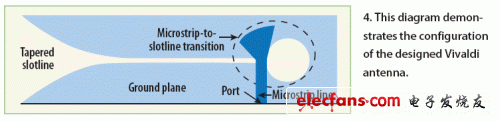 与其它馈电机制相比,从微带到槽线的转换具有许多优点。这一转换可以简单地用常规光刻工艺制造。此外,双面印刷电路板(PCB)的制作可以一侧用微带,另一侧用槽线,以达到紧凑转换。本报告中Vivaldi天线就采用了这种转换类型(图3)。