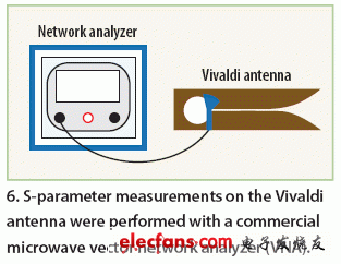 测量包括产生S参数和辐射方向图。图6是用于评估Vivaldi天线S11参数的测试设置实例。在进行测量之前,矢量网络分析仪(VNA)必须先完成校准。然后将Vivaldi天线的50Ω连接器和VNA的端口1连接器通过一根50Ω的低损耗同轴电缆连接起来。VNA测量频率范围被设为8到12GHz。