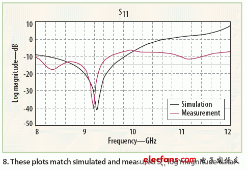 图8画出了测量得到的S11结果(以dB为单位的log magnitude相对于频率的曲线),并与ADS仿真得到的结果进行了比较。从图中可以看出,仿真结果和测量值非常匹配。两个图中的任何差别可能源自电缆和天线输入之间的失配,因为在仿真中没有考虑这一点。在仿真期间,输入端口位于基板的边缘。但在实际测量中,SMA连接器被焊接在天线基板的里面,因此实际的传输线要比仿真中使用的传输线短。