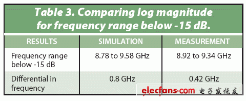 表3对上述频率范围内电平低于-15dB的S11 log magnitude仿真和测量数据进行了比较。数据表明天线具有很宽的频率范围,而且设计可以在9.20GHz点工作得很好,因为仿真和测量的S11参数值都小于-15dB。