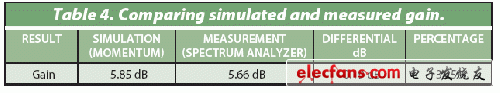 通过计算以dB为单位的增益,可以对天线的辐射效率和整个天线系统的效率作出评估。表4对仿真和测量得到的增益进行了比较。许多因素会影响增益,包括用于建造天线的材料、材料的物理尺寸和属性、天线组件以及组装它们的方法。