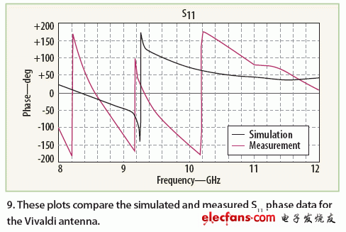 在该Vivaldi天线设计中发现仿真和测量得到的S11相位有一些差别(图9)。仿真只表明一次相位改变,而测量得到的数据表明有三次相位改变。在9.10到9.30GHz范围内发生了轻微的相位移动。在9.20GHz点,仿真得到的相位结果是-77.738度,而在同样频率点测量得到的结果是49.710度,相差127.448度。