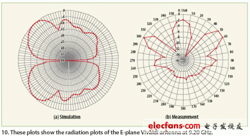 在9.20GHz点对Vivaldi天线的辐射方向图进行的仿真和测量结果如图10所示,从中可以看出也有一些差别。仿真结果表明,天线并不以定向方式辐射,而测量结果是定向辐射的,而且当天线和发射器面对面时辐射量很高。测量得到的辐射图案与端射式方向图相同,因此理论上讲更精确。