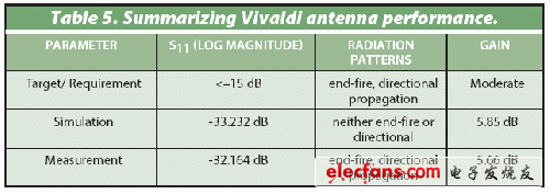 表2列出了对Vivaldi天线的S11 log magnitude性能的测量和仿真结果。感兴趣的频率是9.20GHz,在该频率点仿真和测量得到的S11 log magnitude都低于-30dB。通过比较最小点的仿真和测量结果发现,S11 log magnitude性能均低于-40dB。这表明带发射信号的低反射损耗几乎被天线完成接收。9.20GHz处的任何差异可能是制造质量引起的,虽然这个设计可以接受这些细微的差别。