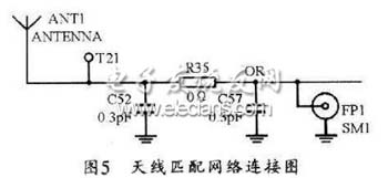 为了方便测量,可将一特性阻抗为50 Ω的同轴电缆的内导体焊接在与天线馈电点相连的50 Ω微带线上,而将外导体就近接在蓝牙模块的地上,同时在同轴电缆的另一端焊SMA接头并连到Agilent网络分析仪N3382A。这样,通过网络分析仪测得的Smith圆图可知,经过匹配网络后的天线阻抗非常接近50 Ω。回损10 dB时的带宽约为90 MHz,可完全覆盖蓝牙所工作的ISM频段(2.400~2.483 GHz),且其驻波比小于2,可以满足蓝牙无线电技术的要求。图4所示是倒F型蓝牙天线的测试结果图。图5给出了其天线匹配网络的连接示意图。