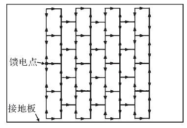 栅格阵列是由栅格单元组成的阵列天线。如图1所示,采用金属导体作为矩形栅格单元,每个矩形单元长为λ0/2,宽为λ0/4.该阵列平行置于接地板上,接地板到到栅格阵列的距离约为λ0/4.整个阵列的馈电很简单,用50 Ω同轴电缆的内导体穿过接地板上的孔接于栅格阵列,外导体则焊接在接地板上。图中箭头表示瞬时电流分布,栅格单元的所有短边上电流相位都保持一致,为主要辐射单元。25个主辐射单元可以实现增益18.1dBi.