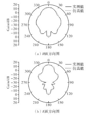 天线中心频率为1 600 MHz,图4是f=1 600 MHz天线的辐射方向图,图中实线代表实测值,虚线代表仿真值。可以清楚地看到,实测方向图与仿真方向图吻合良好,且方向图对称性较好。天线3 dB波瓣宽度为35°,通过微波暗室实测,天线最大增益可达13.3 dBi.为体现增益的提升,给出了f=1 600 MHz未加反射器时的天线方向图仿真值,如图5所示,图中实线代表H面方向图,虚线代表E面方向图。从仿真值可以看出,天线在为未加反射器时的增益为10.6 dBi,充分说明加反射器后,天线增益得到了显著提升。