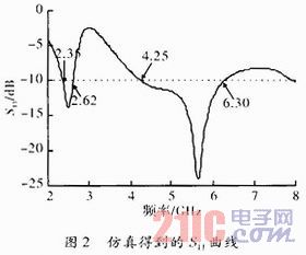 利用Ansoft HFSS进行优化,可得到较好的天线性能。天线的几何参数如下:Wf=3mm,g=0.5mm,L=17mm,W=1mm,Ls=36mm,Ws=28.6 mm,L1=1.5 mm,T=1.5 mm,W1=14.5mm,L2=12 mm,W2=0.5 mm,L3=5.5 mm,W3=1 mm,L4=9 mm,W4=0.5 mm,L5=2 mm。Wf、g分别取3 mm,1 mm使得天线的CPW传输线的阻抗为50 Ω。通过HFSS仿真得到天线的S11仿真结果,如图2所示。可看出天线获得-10 dB同波损耗的两个频段,分别是低频段2.35~2.62 GHz和高频段4.25~6.30 GHz。这两个频段覆盖了IEEE 802.11a/b/g,并避开了WiMax的频段。令天线的两个谐振频率分别为f1,f2(f1低于f2)。