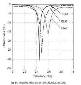 图10所示分别为利用CPW匹配电路的ESA1,ESA2,ESA3返回损耗值之间相互比较,它们的中心频率都在2.45GHz左右。