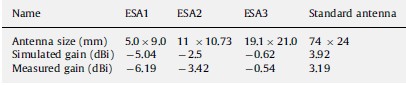 通过表格1知道,尽管在小天线实验装置中存在损耗,但是实验结果中测得的天线增益值与仿真结果测得的结果值是极其相近的。我们可以利用商业3D-EM仿真软件对阻抗匹配的ESA天线增益进行很好的估计。一种倒F天线(尺寸:23×3.7mm)有很宽的带宽,但是需要很大的接地平板(尺寸:46.7×88.8mm)[11]。一种折叠双极振子天线(尺寸:16.8×54mm)有很宽的带宽,但是需要片形电容器和二极管[12]。所以和适的天线需要考虑天线的尺寸和生产装配所带来的费用。