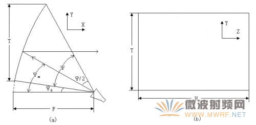 抛物柱面空间功率合成天线包括多个天线单元组成的线性馈源阵列和抛物柱面反射板。空间功率合成的原理示意图和偏馈抛物柱面天线结构如图1所示。微波信号经过分路器分成若干路依次接上移相器和功放通过波导对喇叭单元进行馈电。为了实现水平极化,16路喇叭E面水平放置以D为阵元中心间距组成阵列放在抛物柱面的焦线位置作为馈源,微波信号由喇叭发射经过抛物柱面反射后在空中进行高功率合成。抛物柱面天线的俯视图和侧视图如图2所示,天线采用偏馈的形式,为了避免了抛物柱面反射波对馈源的影响,截去抛物柱面张角小于Y0=5o的部分。抛物柱面夹角为Y=55o,最大张角为Y0+Y=60o,喇叭的照射角度为Ym=32.5o,Ym为抛物柱面夹角的平分线指向。抛物柱面的水平投影宽度为T。抛物柱面的高度为H,为了减少抛物柱面的后向辐射,H比喇叭阵列的垂直面总高度两边分别多留出H0=0.625l的高度,抛物柱面的有效口径尺寸为T*H。抛物面的焦距为F=12.5l。